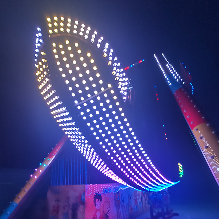 24座海盗船通过驱动系统带动船体围绕中心轴进行前后摆动。随着运行过程的推进,摆动幅度逐步增大,在高点位置形成短暂停留,让游客感受到明显但不过度的失重体验。整套运行由控制系统进行统一管理,节奏清晰、运行平稳。