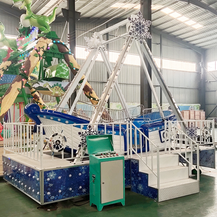 12座冰雪款式海盗船是在经典海盗船结构基础上,结合冰雪主题进行外观与细节设计的一种小型摆动类游乐设施。设备整体风格清新明亮,视觉亲和力强,运行节奏适中,特别适合儿童及家庭游客体验,是亲子区域中较受欢迎的基础型设备之一。