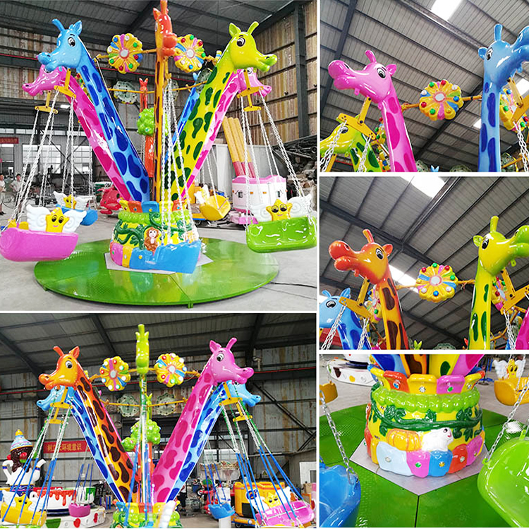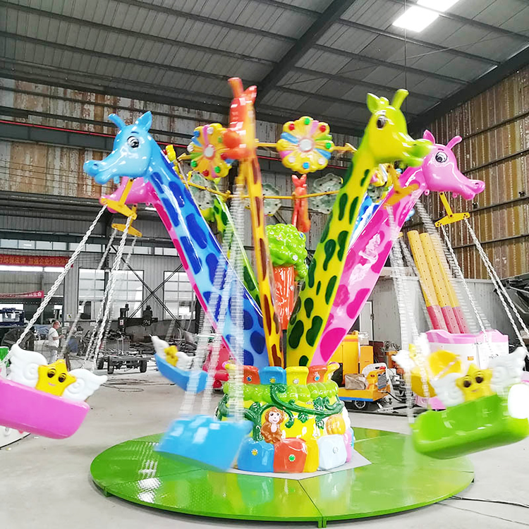 12座长颈鹿摇头飞椅是一种以旋转飞椅结构为基础,结合长颈鹿卡通造型与摇头动作设计的亲子类游乐设备。设备在旋转运行的同时增加轻微摆动效果,体验轻松有趣,外观亲和度高,适合儿童乐园及亲子游乐区域使用。