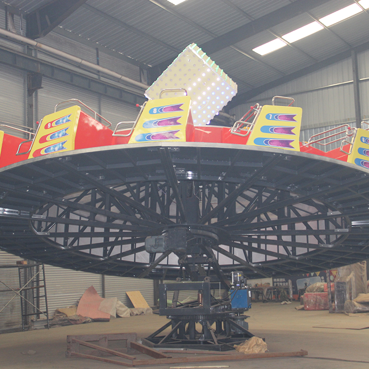 40座飞天转盘属于高人气旋转类游乐设施,其核心特点在于高速旋转 + 大幅度外摆的复合运动方式。设备在运行过程中,转盘围绕中心轴快速旋转,座舱在离心力作用下向外展开,形成强烈的速度感和空间感,能够有效吸引年轻游客和体验型人群。